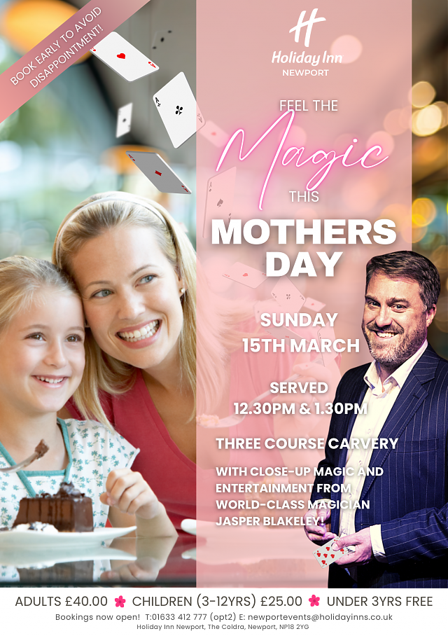 This Mother’s Day, why not trade the apron for a wand? We invite you and your family to join us at the Holiday Inn Newport (The Coldra) for an afternoon filled with delicious food and literal magic.